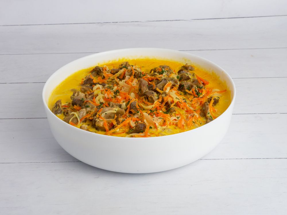 желудки куриные, лук, морковь, сметана, сливки