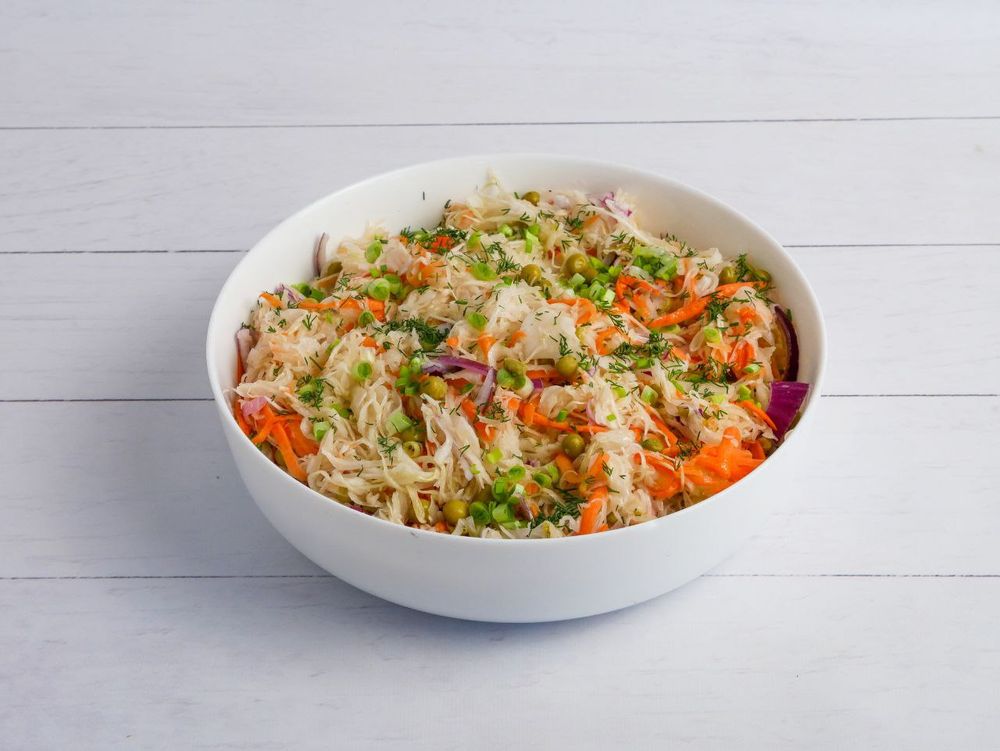 капуста квашеная, горошек конс, лук красный, масло подсолнечное