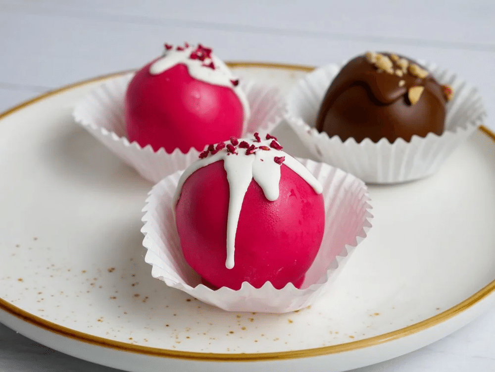 бисквит со сливочным маслом, сгушеным молоком, начинка из пюре манго и малинового пюре, покрыт шоколадом