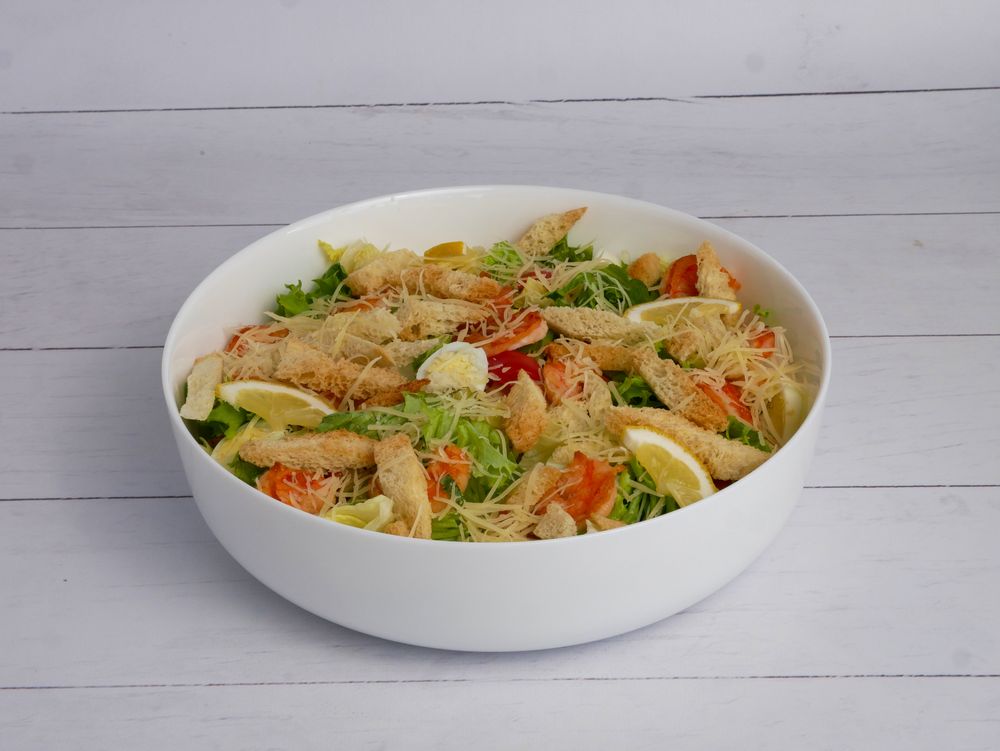креветки, томаты черри, микс салата, сыр пармезан, сухарики, соус цезарь