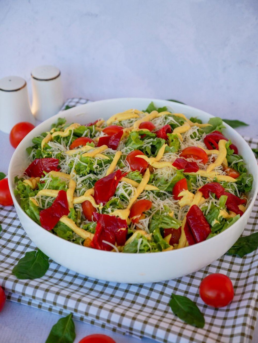 буженина, сыр голандский, сыр пармезан, перец болгарский маринованый, томаты черри, лист салата, сухарики, майонез, орегано, куркума, сок лимона