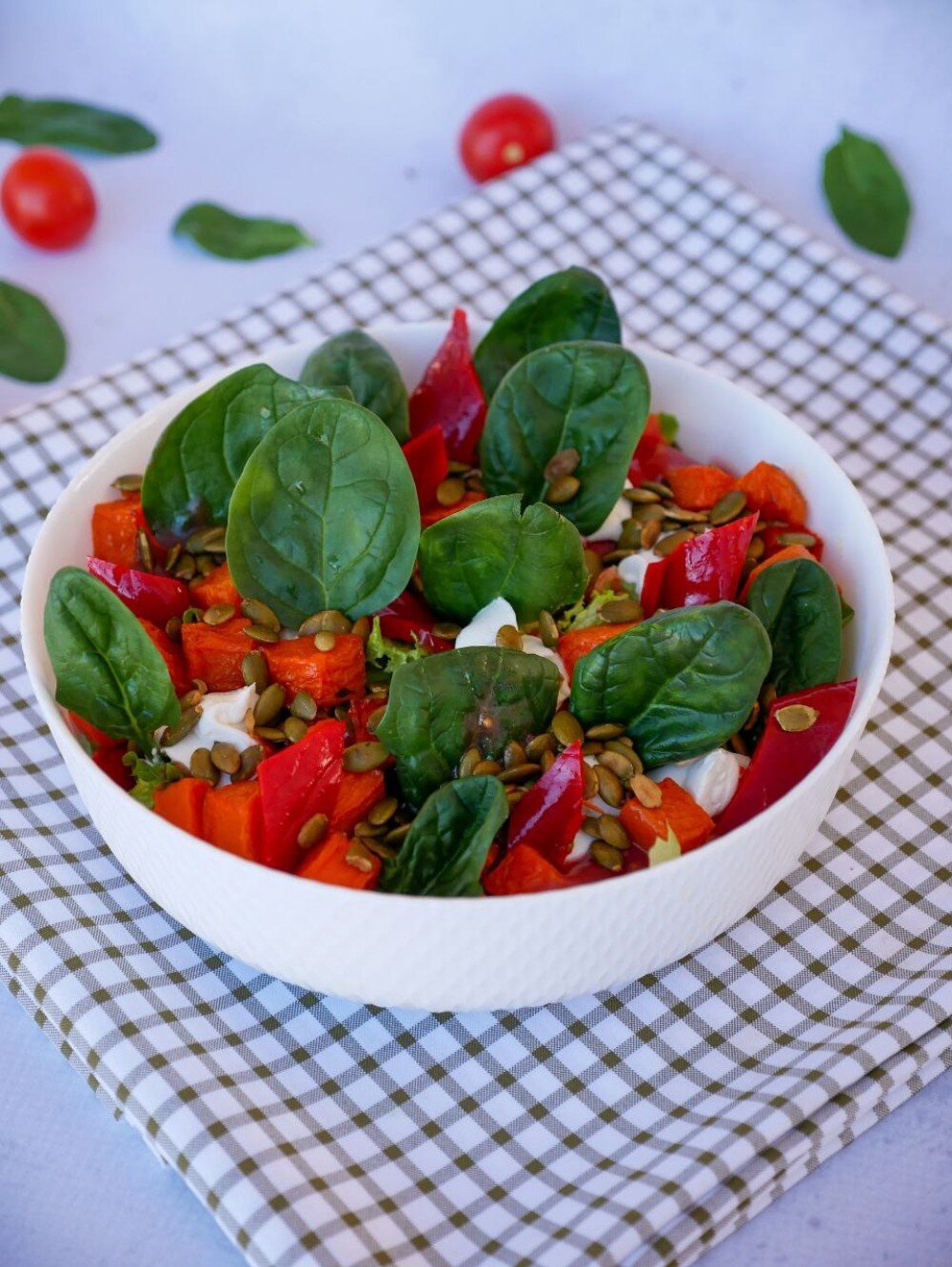 тыква запеченая, перец болгарский маринованый, семена тыквы, лист салата, сыр фетакса, сливки, сыр маскарпоне, сметана, мед, малина, уксус бальзамический, горчица