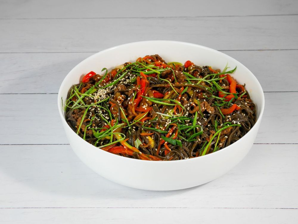 лапша гречневая (соба), говядина, морковь, перец болгарский, цукини, баклажан, устричный и унаги соусы, кунжутное масло