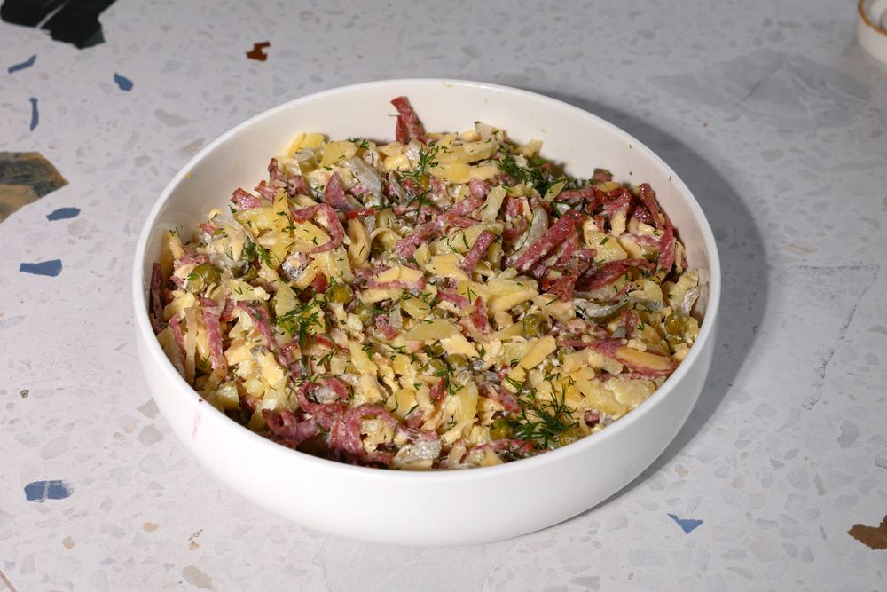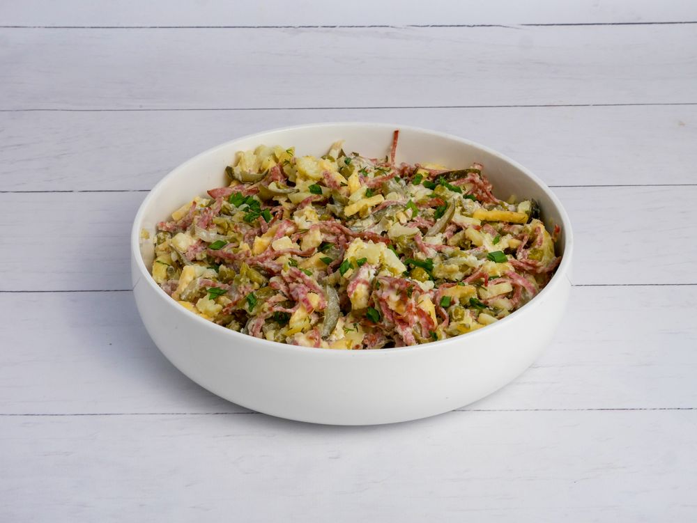 колбаса копченая,картофель отварной, сыр российский, огурцы соленые, лук репчатый, горошек консервированый, майонез