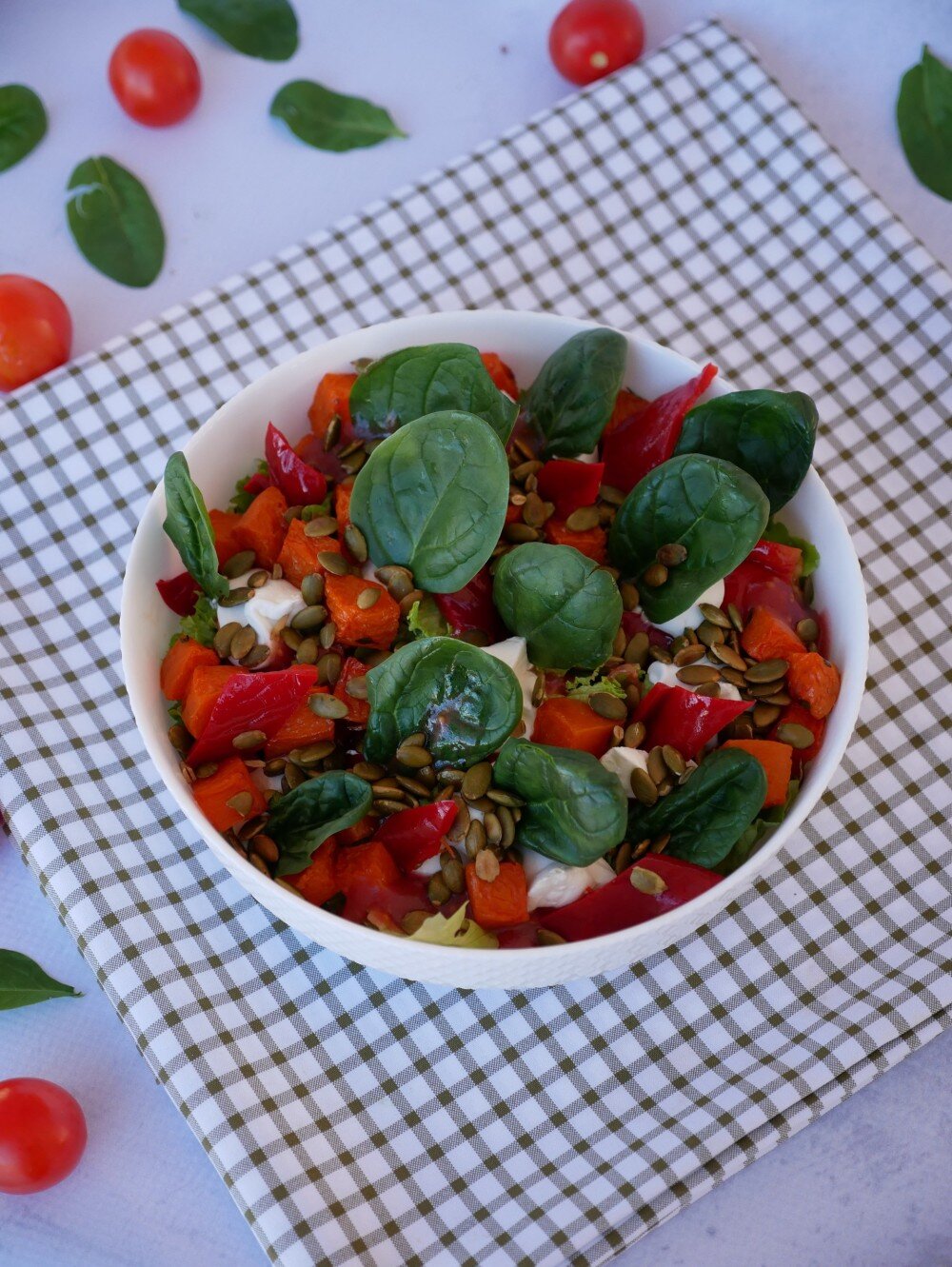 тыква запеченная, перец болгарский маринованый, семена тыквы сырный мусс, мусс из малины, шпинат