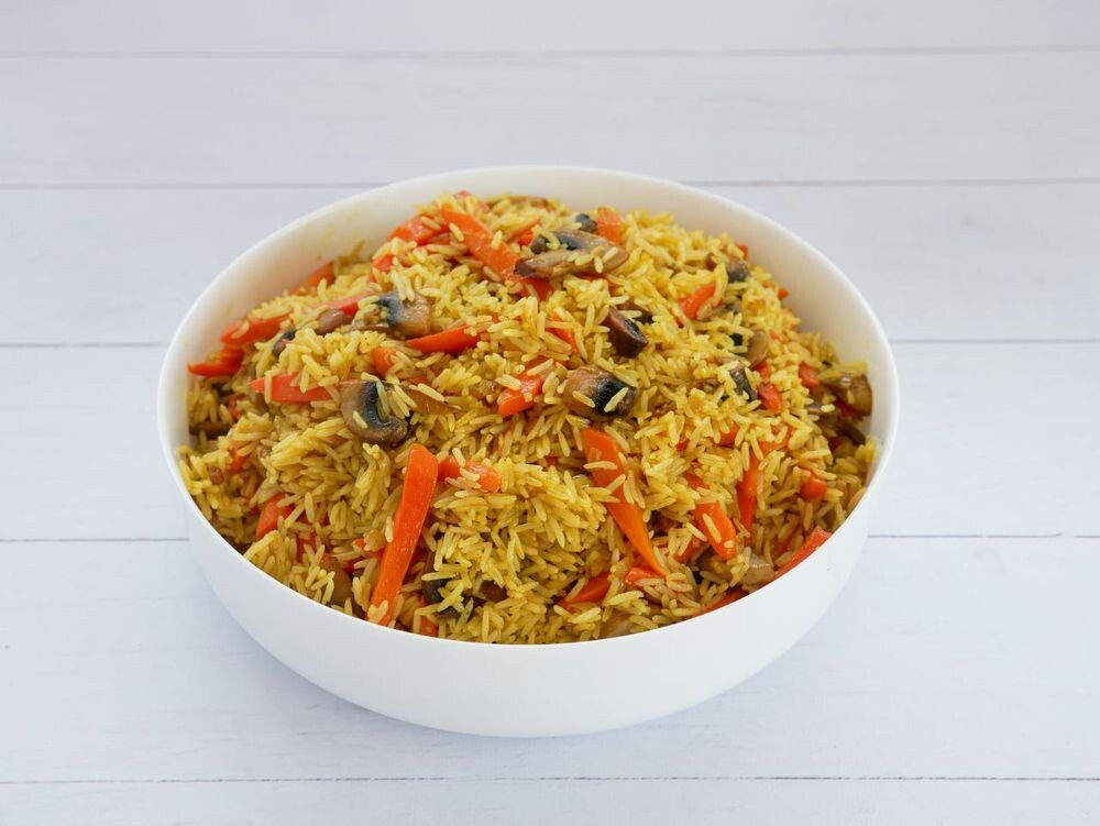 рис басмати, морковь, лук, шампиньоны, кориандр, зира, куркума